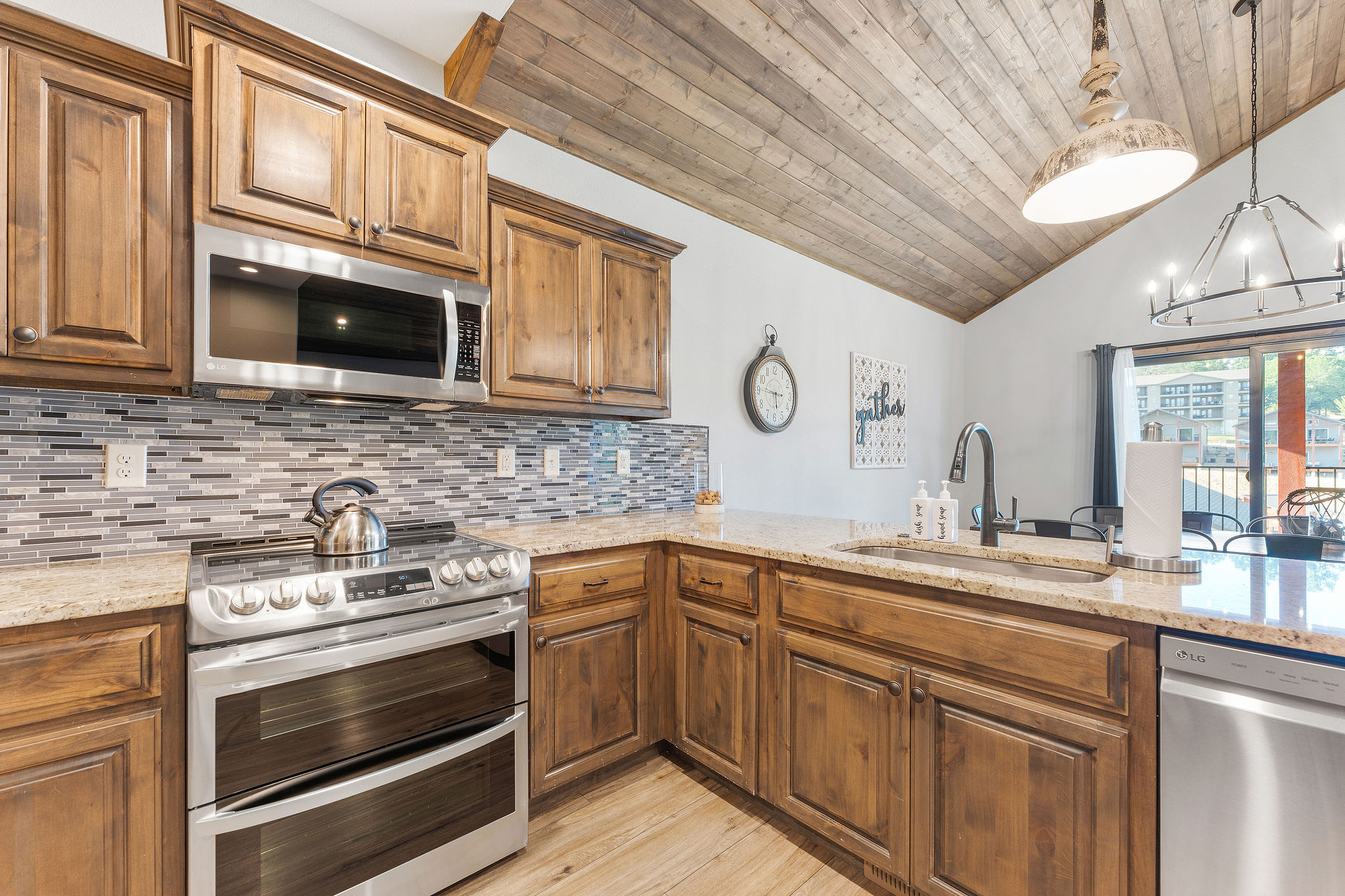 Enjoy cooking your meals in the fully stocked kitchen with beautiful granite countertops. The dining area is perfect for large groups with a large table that seats 12. Spend your evening by the living room fireplace and relax after a full day of fun. From the living room, you can step out onto the large deck and enjoy a friendly game of connect 4 on the large deck. This home has it all- including a private hot tub and a boat slip!