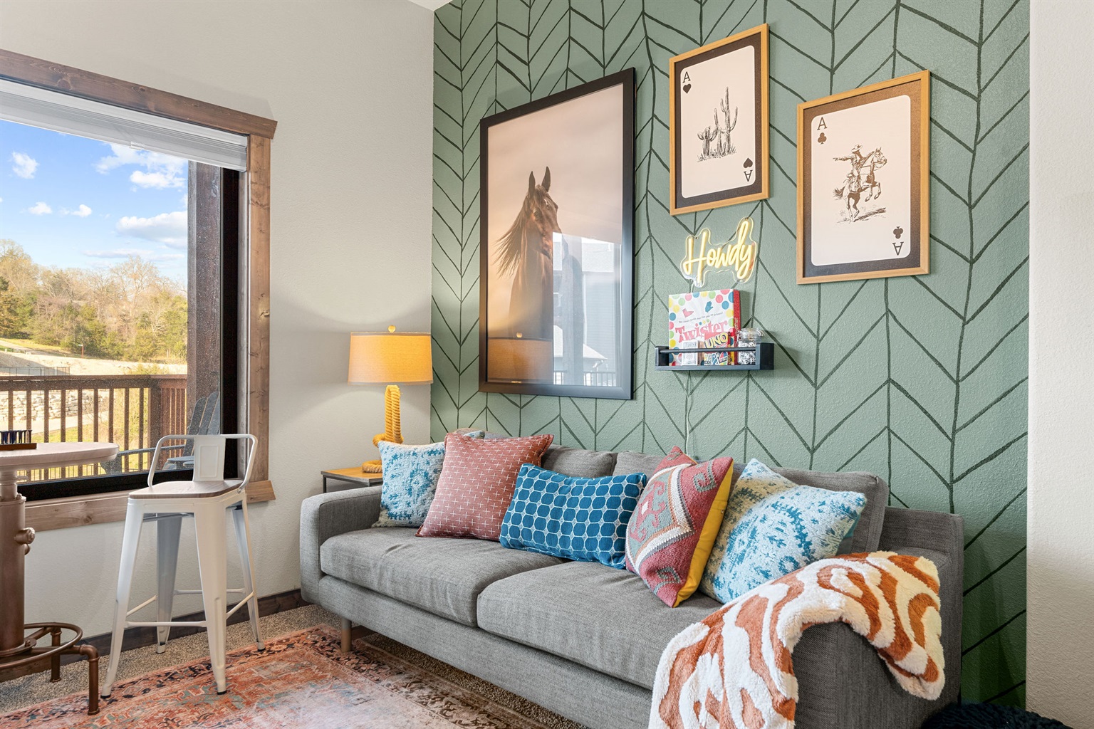 The living room invites you to unwind with cozy seating and a warm fireplace 🔥—the perfect place to relax after a full day of lake or Branson adventures.