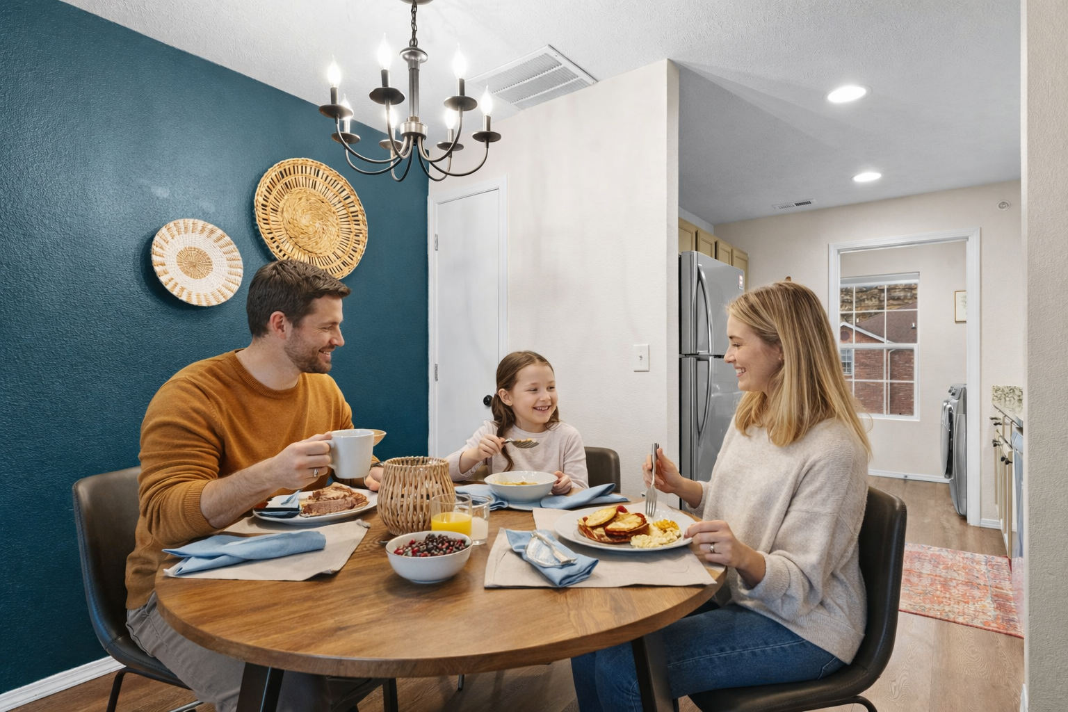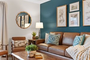 Indigo Pines features a bright open-concept living area that connects the living room, dining space, and kitchen. Relax on the comfortable seating while watching TV or gather around the dining table for meals and game nights.