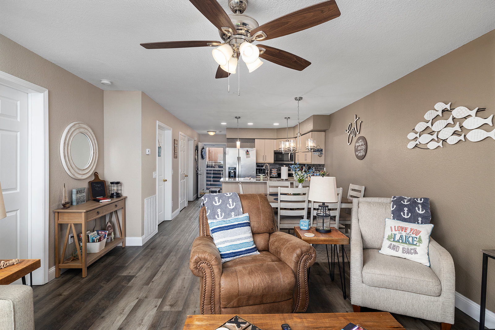The interior of the condo is equally captivating. The open-concept living area is designed to maximize comfort and functionality, with ample space for relaxation and entertainment. Large windows allow natural light to flood the space, enhancing the warm and inviting atmosphere. Whether you're lounging on the sofa or enjoying a meal at the dining table, you'll always have a mesmerizing backdrop of the lake.