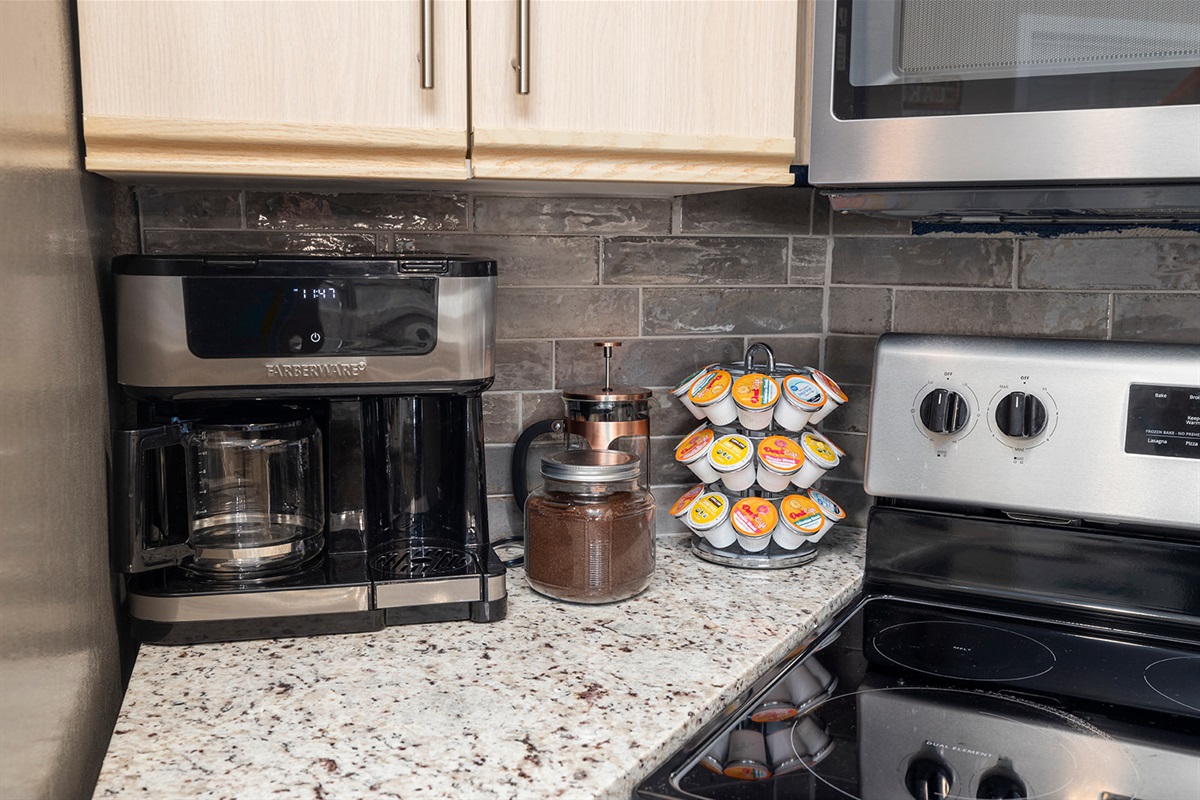 The kitchen is equipped with modern appliances and stylish finishes. Prepare delicious meals while gazing out at the shimmering lake, or sip your morning coffee on the balcony and let the soothing sounds of nature surround you.